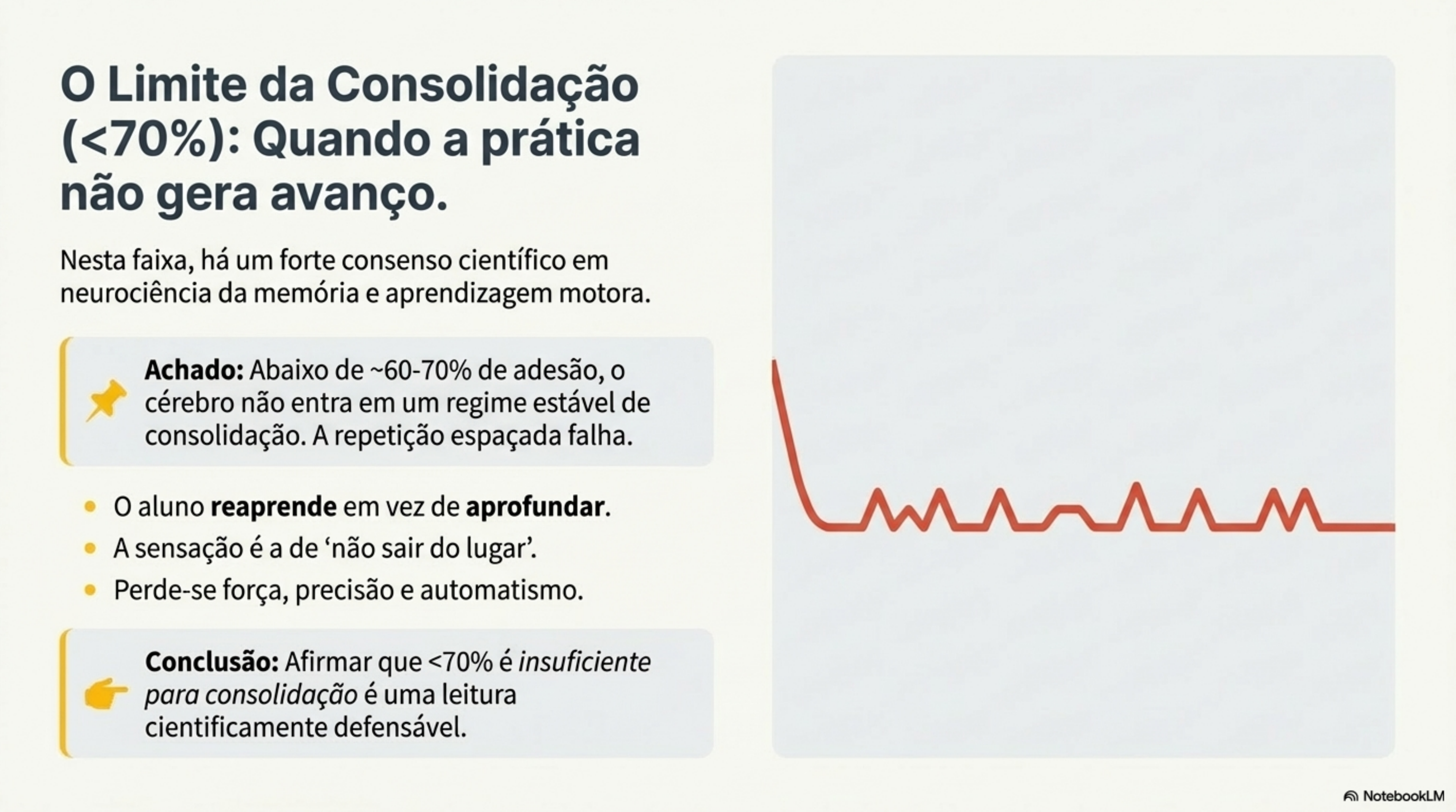 Com pouca aderência, o cérebro não consolida. Resulta em muito reaprender e pouca profundidade.